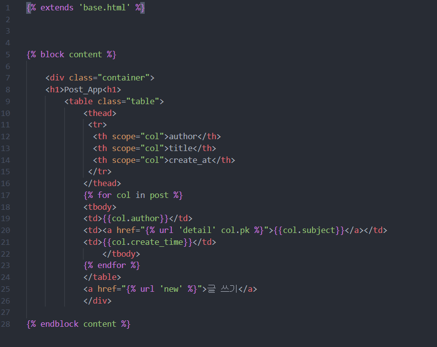 {% extends 'base.html' %}이 상속받겠다는 코드입니다.