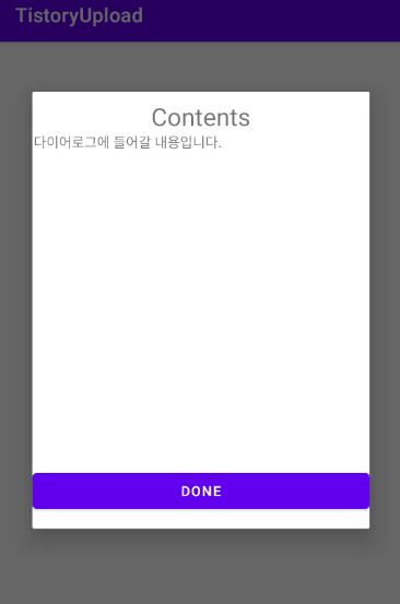 CustomDialog생성자의 두번째 파라미터값으로 아까 추가한 contents값입니다!. 저 안에 메세지를 전달하면 됩니다.