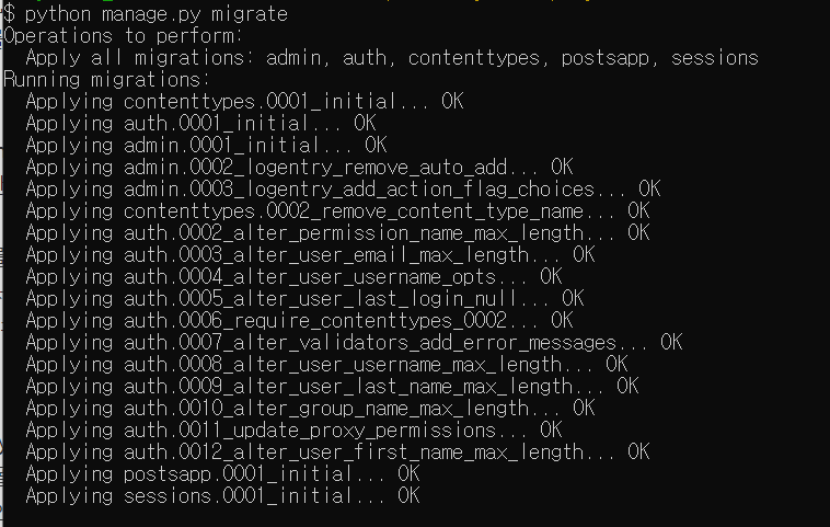 그럼 이제 python manage.py migrate를 해주시면 끝!