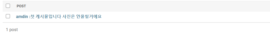 저 포스트가 admin:첫 게시물입니다 사진은 안올릴거에요로 출력 되는 겁니다 ㅎㅎ