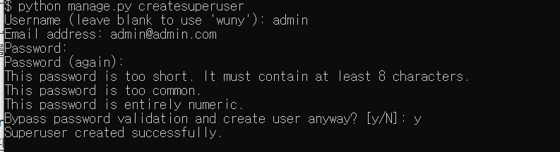 python manage.py createsuperuser 를 쳐주세요! 띄어쓰기 없습니다 오타 주의하세요