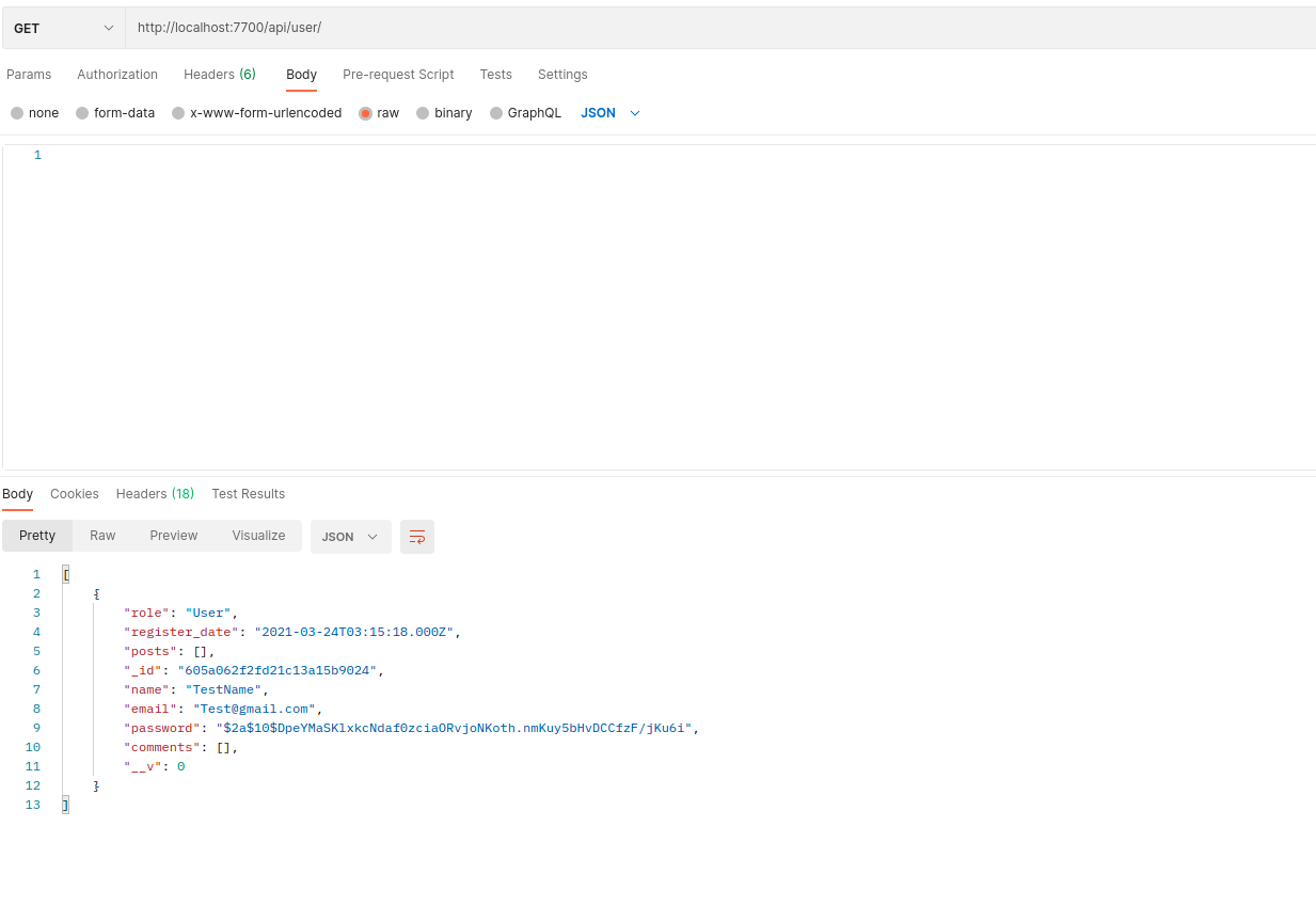 아무튼 다시 포스트맨에서 Send를 눌러주면 성공적으로 회원가입 정보가 보내진걸 알 수 있다.