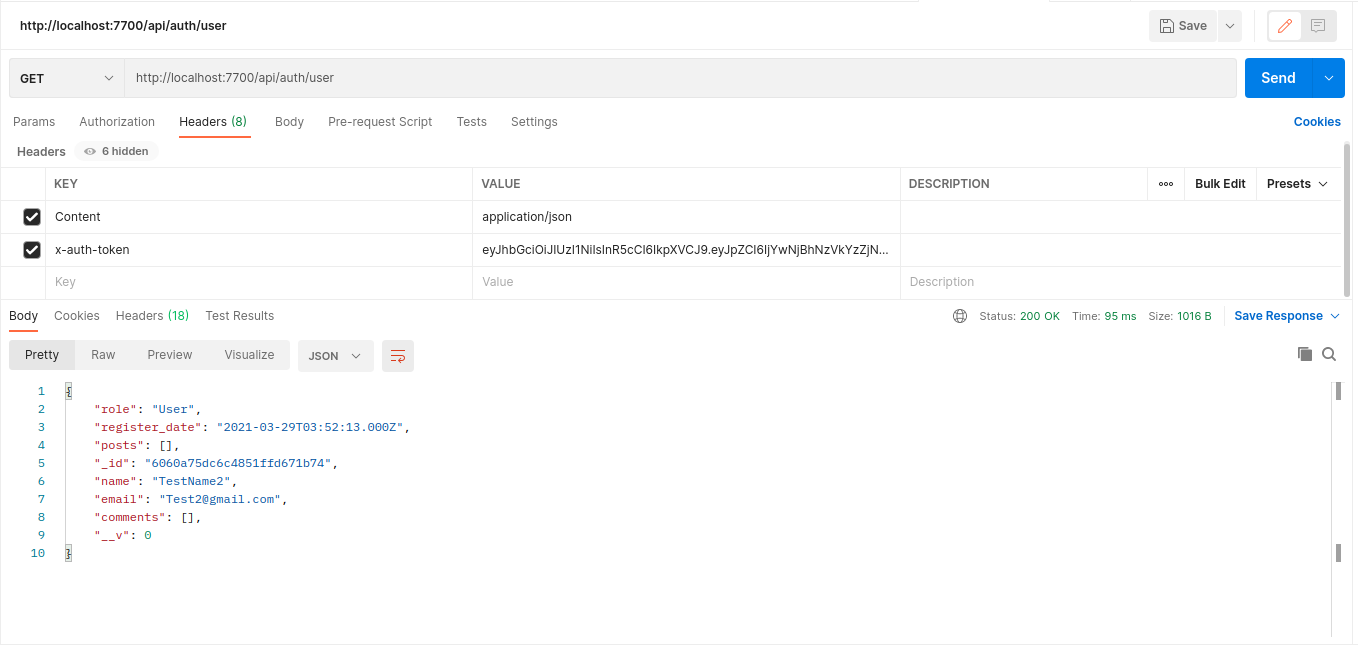 로그인했을때 받은 토큰값을 넣어 GET요청을 하면 아래와 같이 회원정보가 나오면 성공이다.