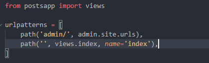 views가 함수를 정의하는 곳이라고 했죠? 저희는 메인페이지에 게시글들을 보여줄거고 함수이름은 index으로 할거고 name도 헷갈리지않게 index로 해주세요.